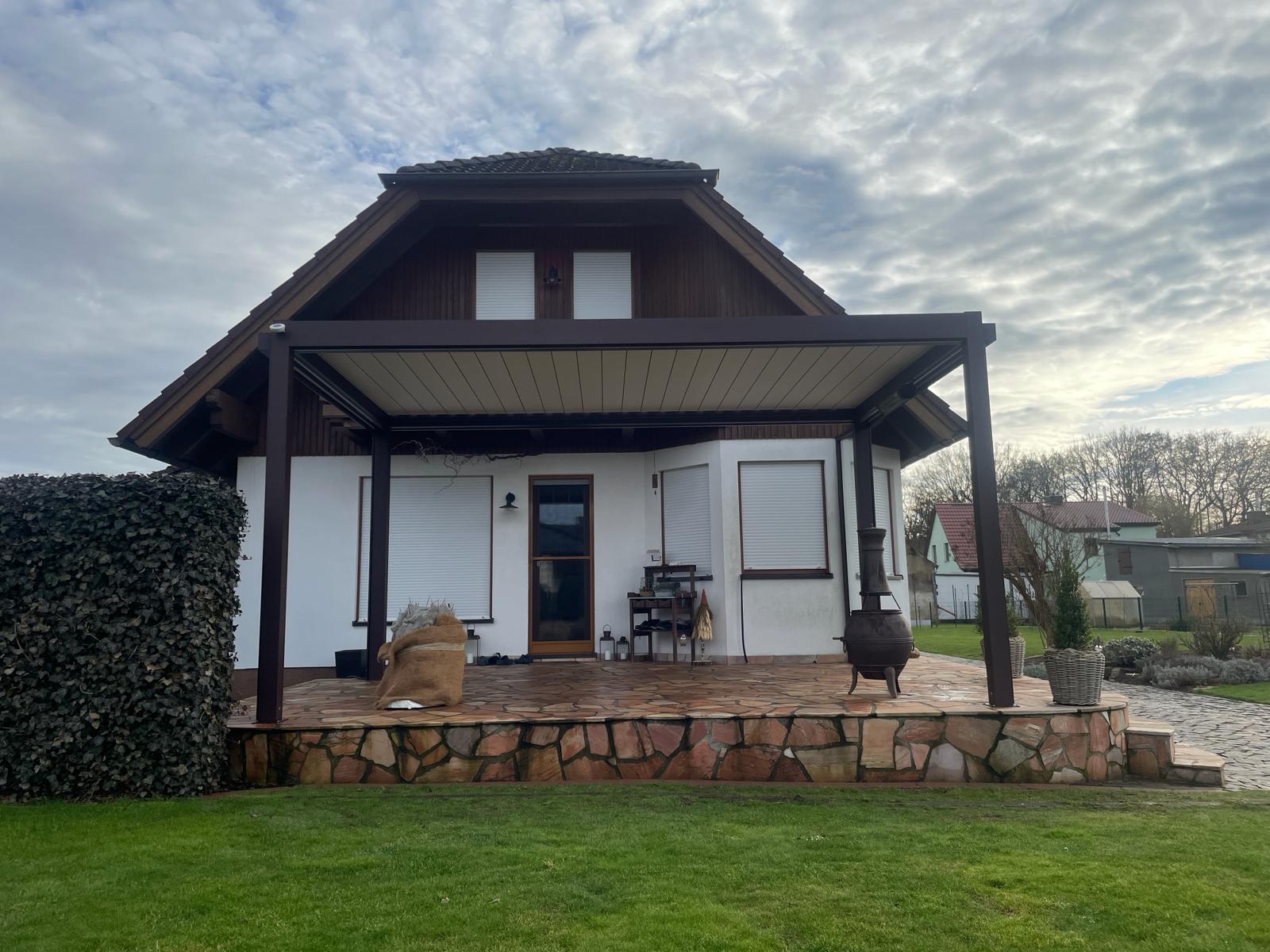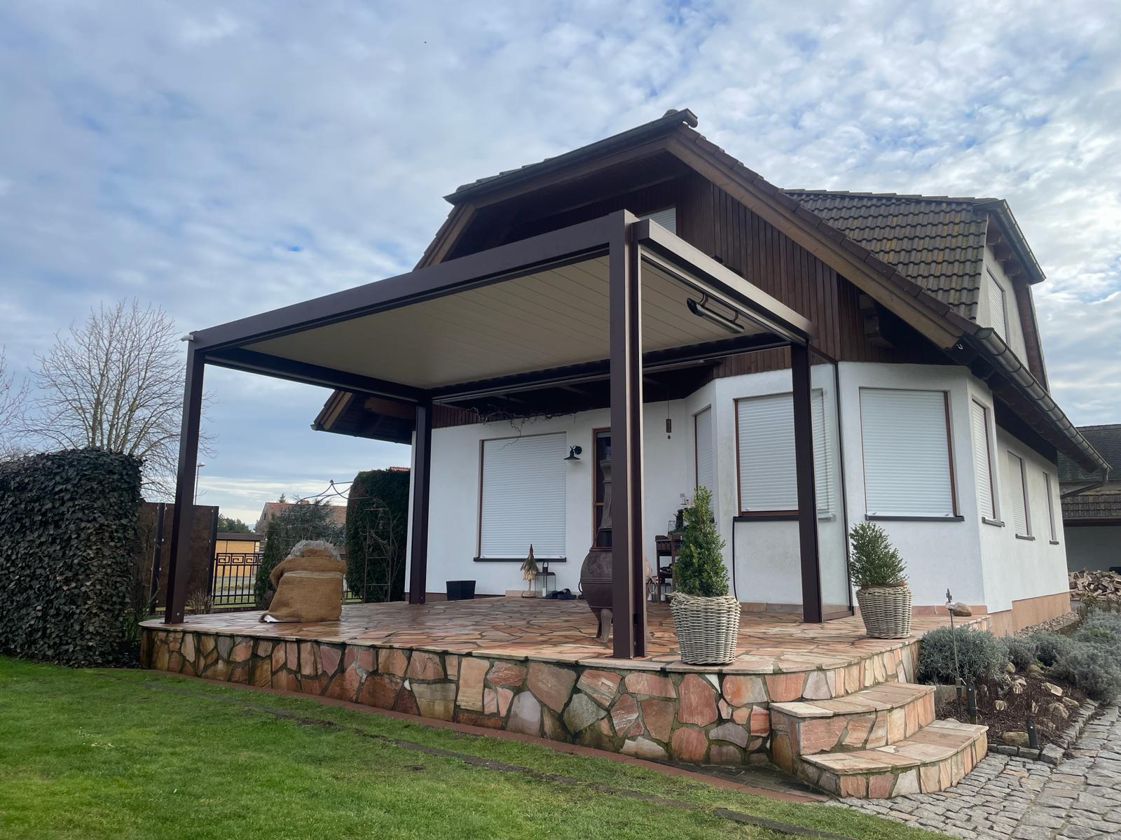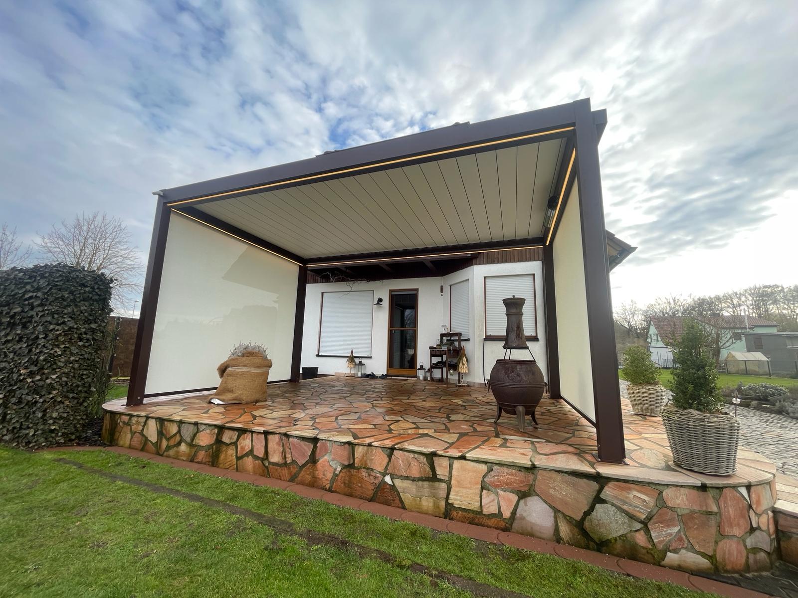 Na życzenie klienta profile konstrukcji i korony w kolorze brązu oraz białe lamele dachowe. Całość tworzy idealną kompozycję, którą uzupełniają dwie rolety tekstylne zamontowane na bocznych ścianach, osłaniających od wiatru i zapewniających prywatność.