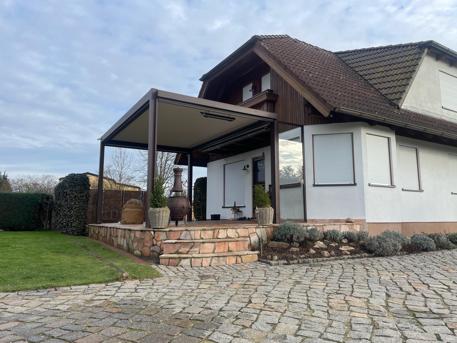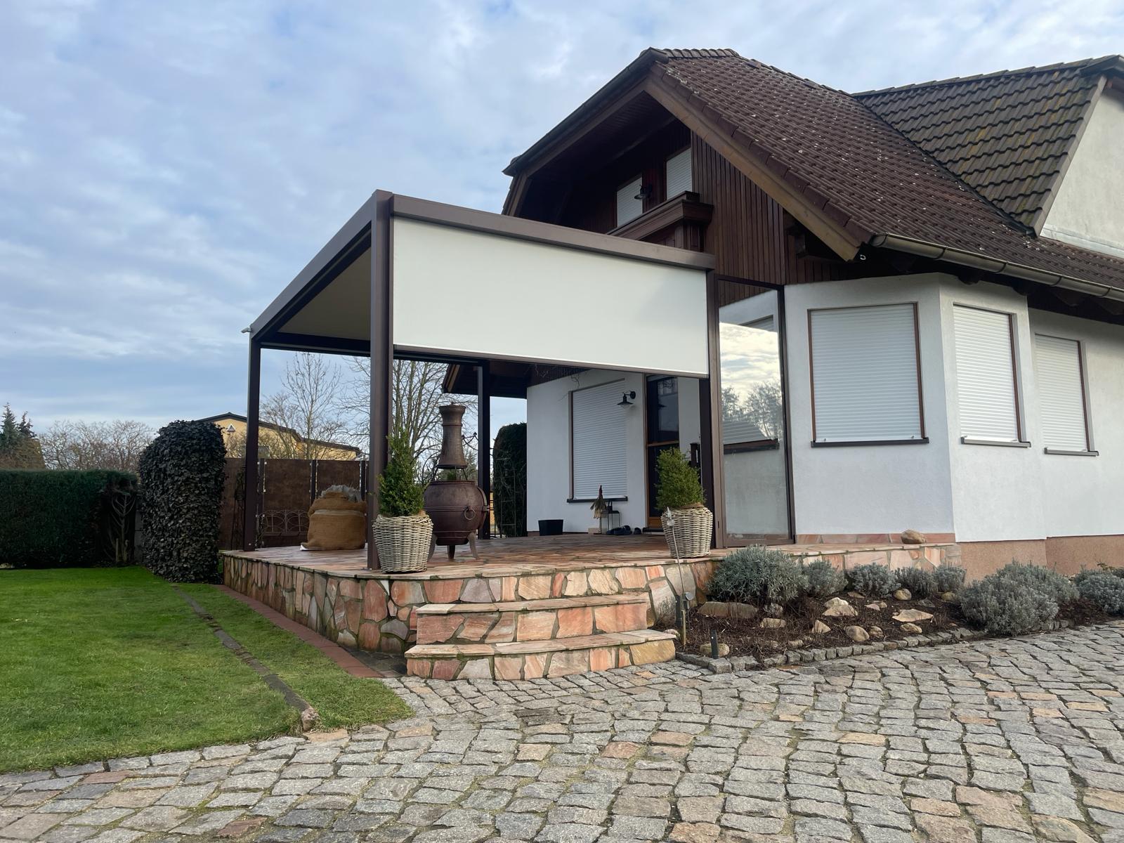 Pergola STANDARD zamontowana na terenie Niemiec. Konstrukcja na 4 nogach, ale montowana do istniejącego balkonu. Zobacz możliwości montażu pergoli.