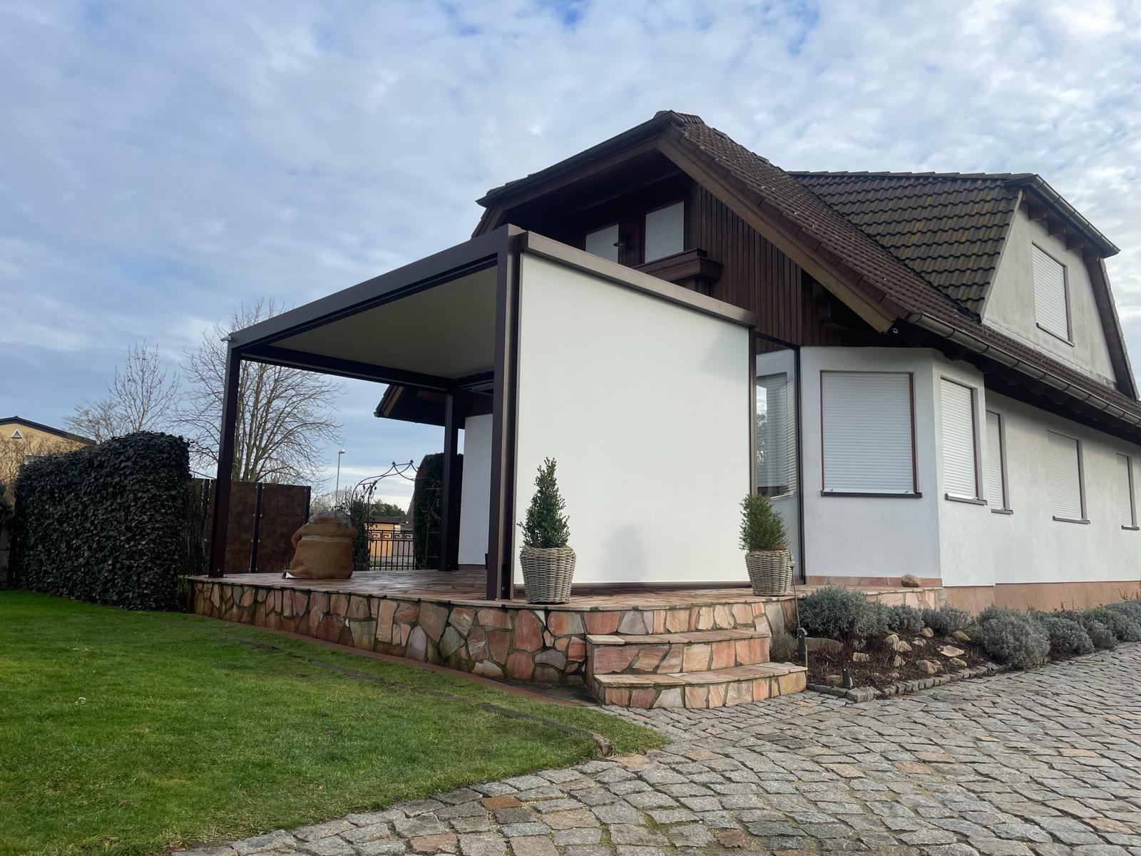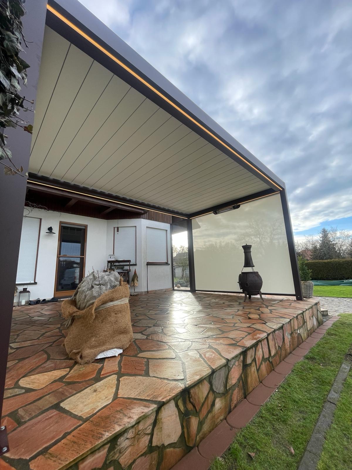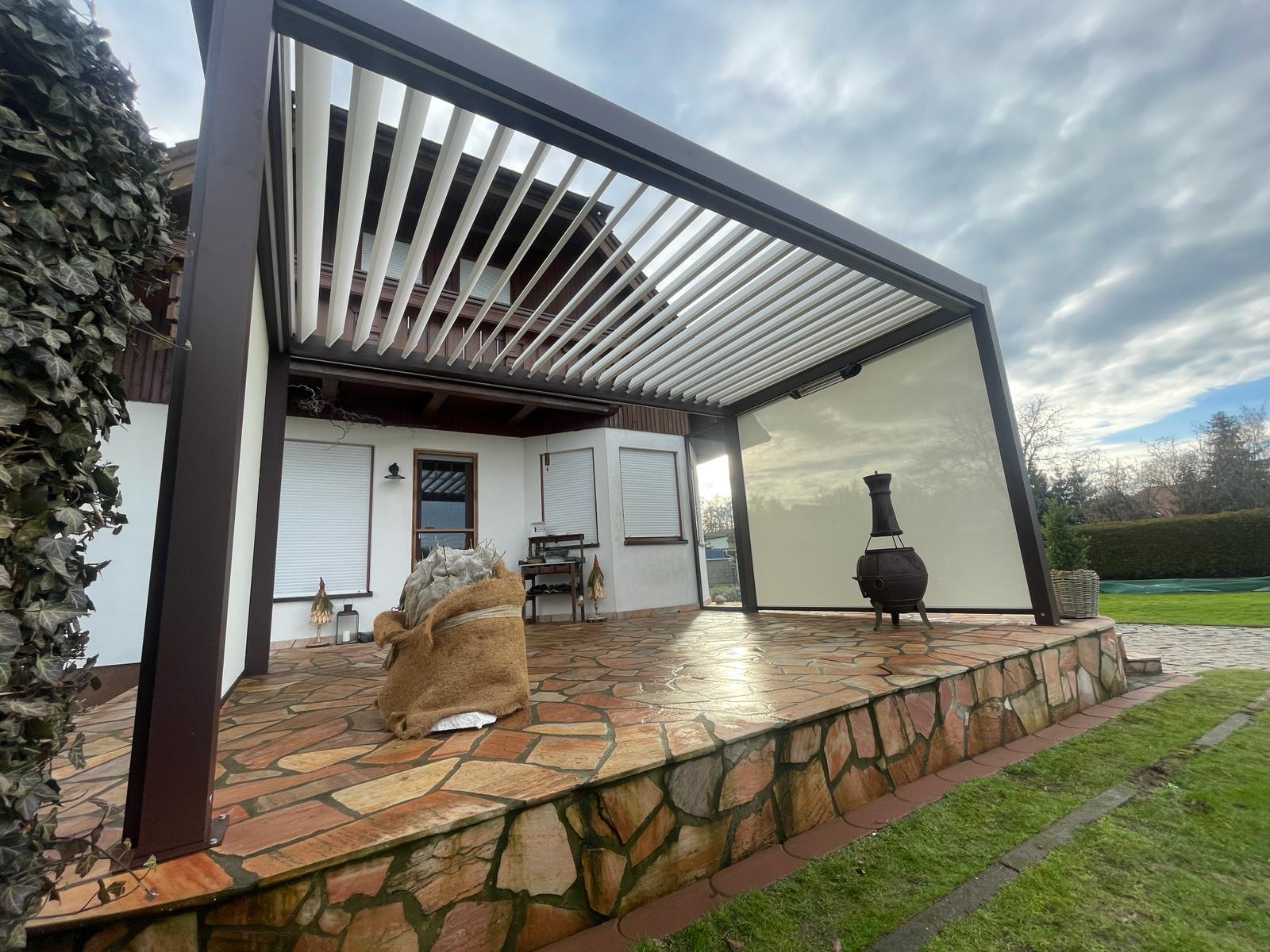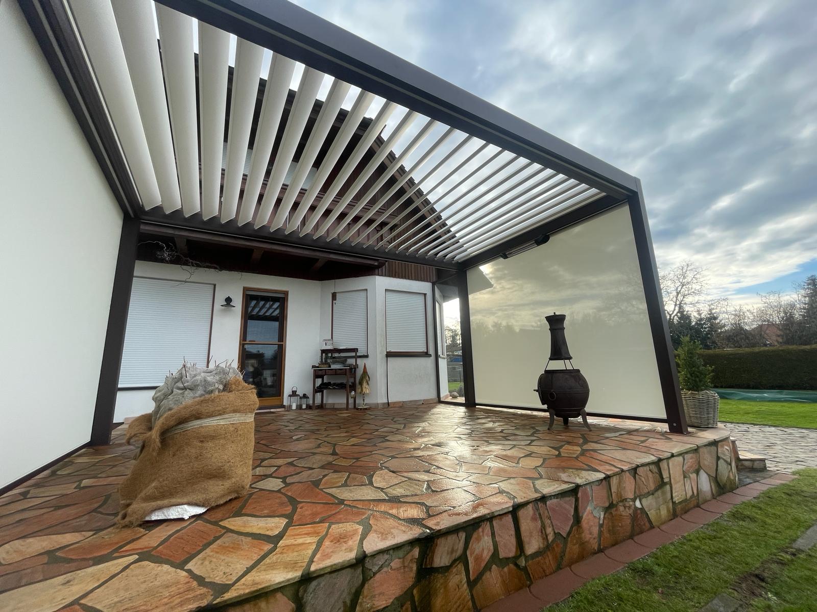 Oczywiście pergola w pełni sterowana z pilota – lamele dachowe, oświetlenie LED oraz osłony ścian bocznych.