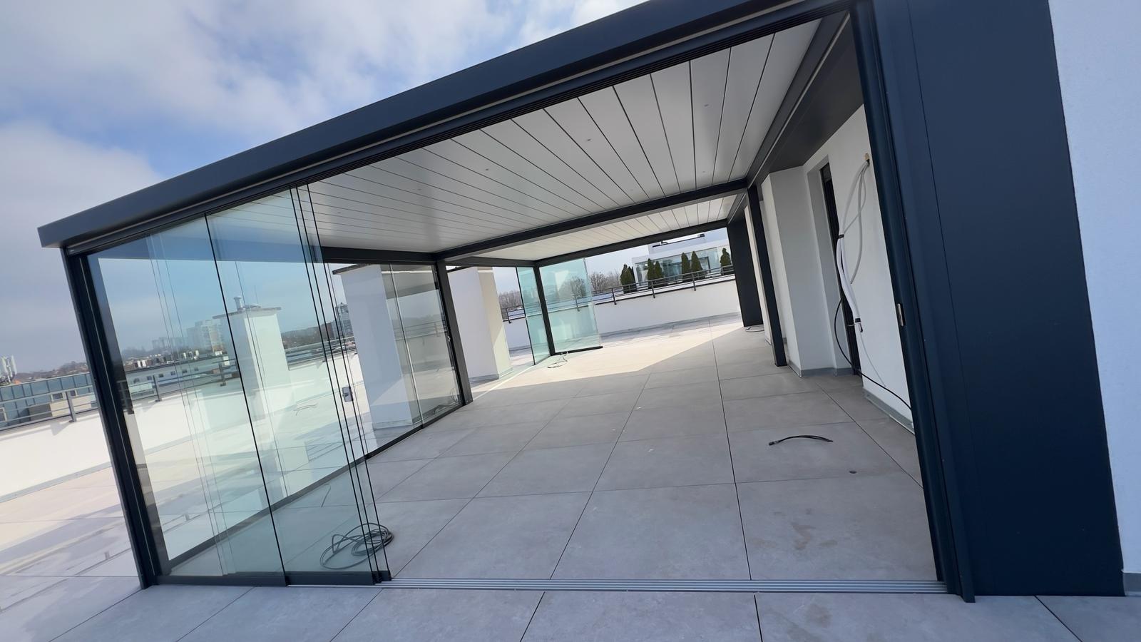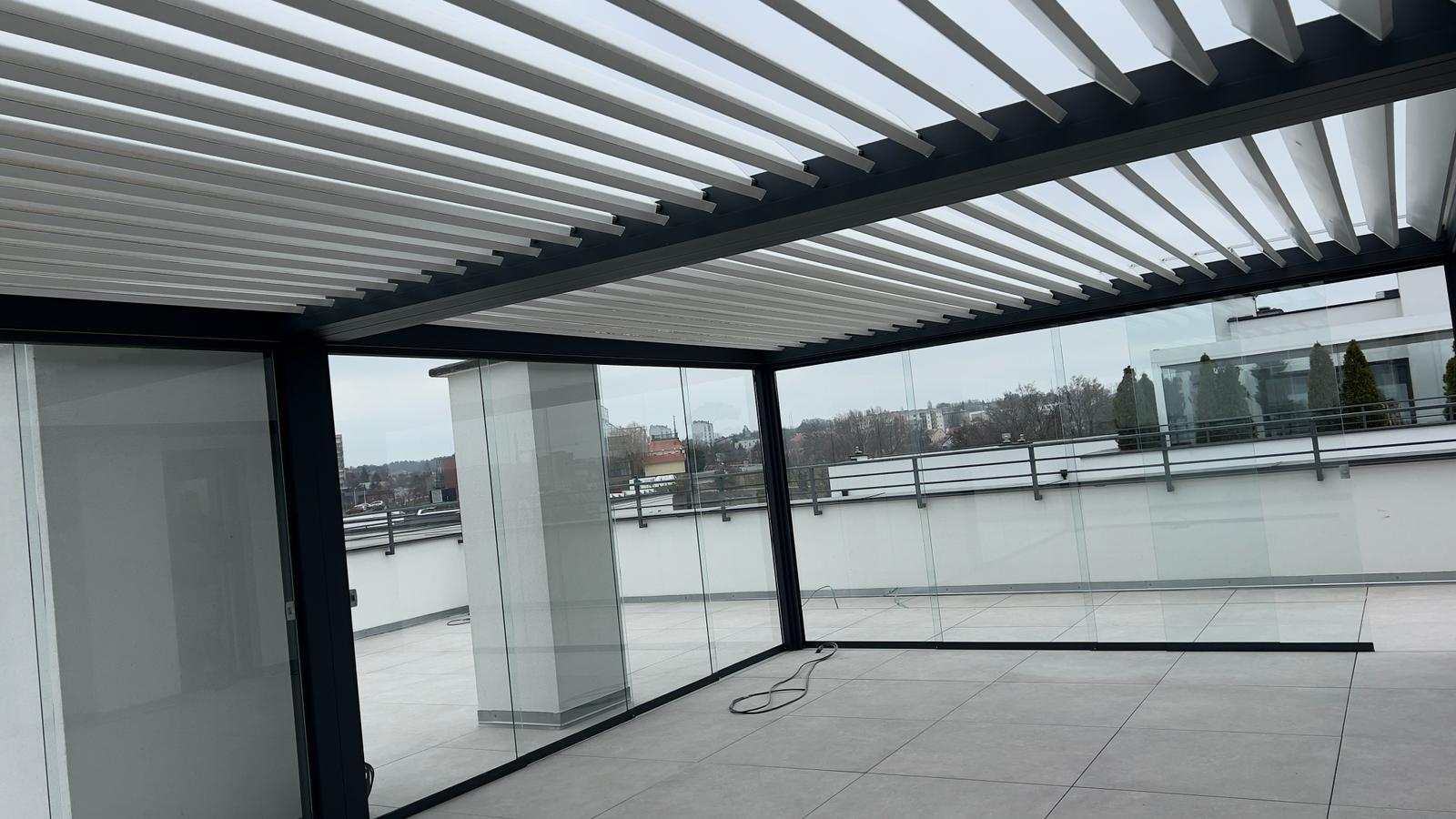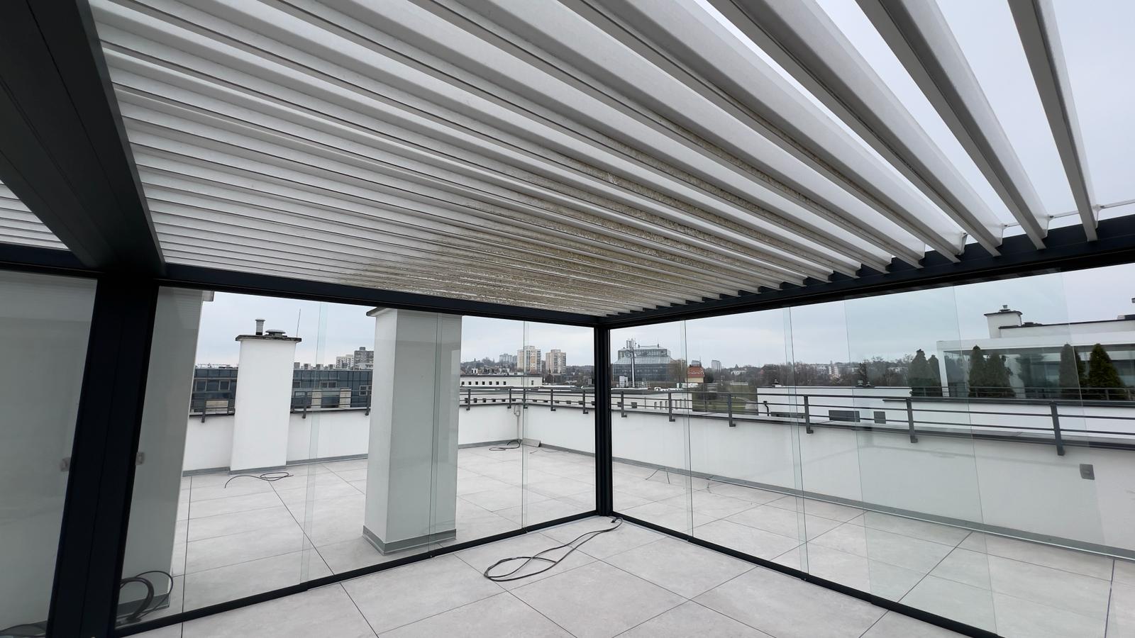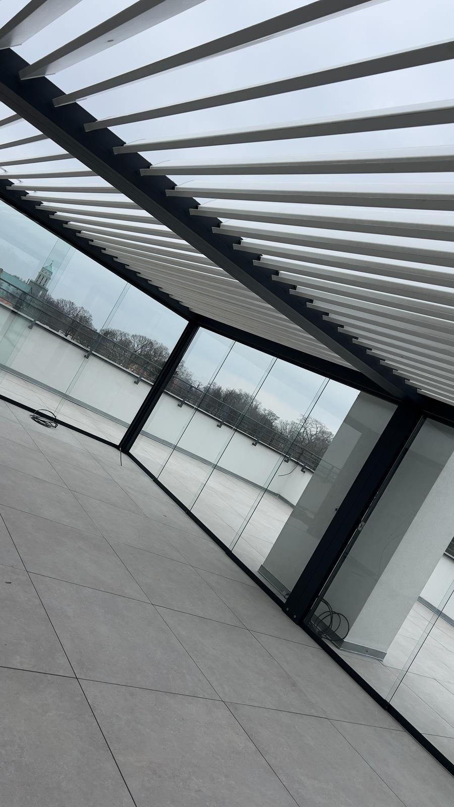 Pergola PREMIUM – to jedna z naszych perełek. Pergola Aluminiowa zamontowana na dachu jednego z bloków w centrum Zielonej Góry.